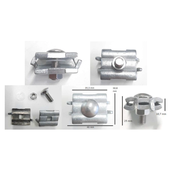 Clamp is comprised of two hot dip galvanized steel jaws. Jaws are made of 3,7mm steel sheet. Stainless steel M8x25 oval square screw with M8 hex nut. Retention plastic washer with 18,6mm diameter. Clamp without marking.