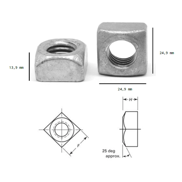 Used to fasten attachments to machine bolts, carriage bolts, and insulator pins. Manufactured from Grade 2 Steel. Nut without marking. Hot dip galvanized to meet ASTM Specification A153.