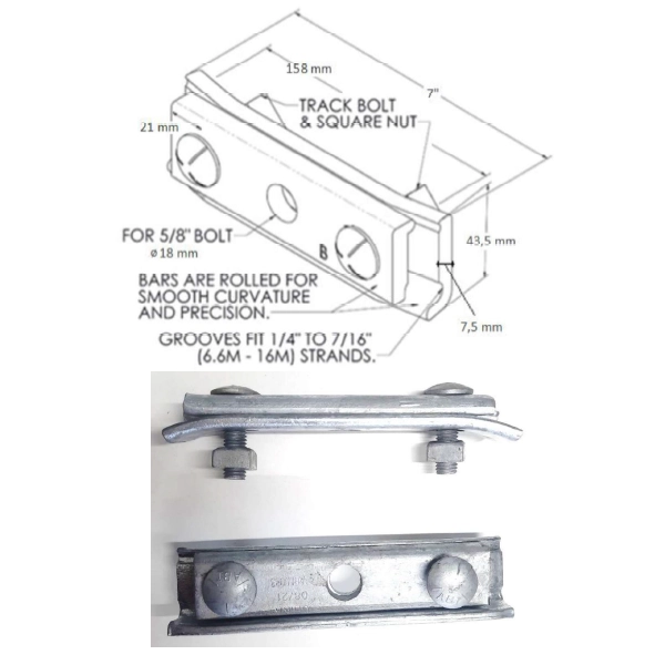 Clamp consists of two mating plates, two 5/8″-11 track bolts with attached square nuts.